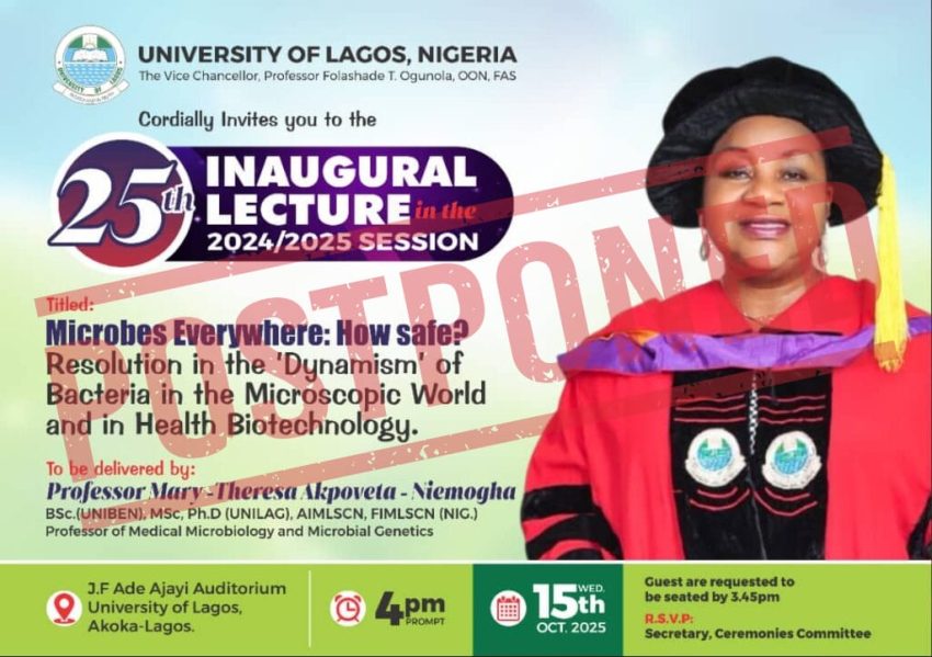 The 25th Inaugural Lecture of the University of Lagos (UNILAG) in the 2024/2025 Academic Session titled: Microbes Everywhere: How Safe? Resolution in the Dynamism of Bacteria earlier scheduled for Wednesday, October 15, 2025, has been postponed.