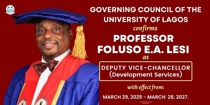 The Governing Council of the University of Lagos has confirmed the appointment of Prof. Foluso Ebun Afolabi Lesi as Deputy Vice-Chancellor (Development Services).