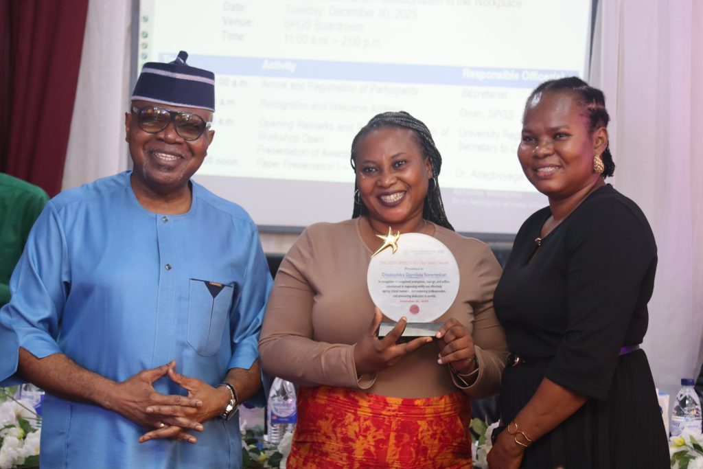 A major highlight of the One-Day Workshop and End of the Year Retreat was the announcement of Olaoluyinka Damilola Shoremekun (Senior Assistant Registrar) as winner of the School of Postgraduate Studies (SPGS) First Responder Award in acknowledgment and celebration of her pro-activeness, diligence, discretion and initiative all through the year 2025.